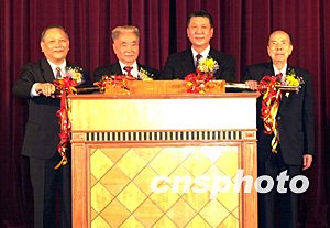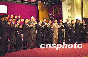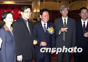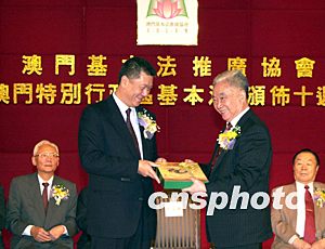 何厚鏵、原全國人大常委會副委員長王漢斌、全國政協(xié)副主席馬萬祺及中央駐澳聯(lián)絡(luò)辦主任白志健在酒會為紀(jì)念《澳門基本法》頒布十周年電視特輯首播儀式揭幕。作者:李剛
