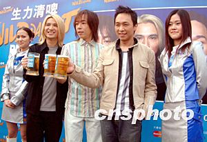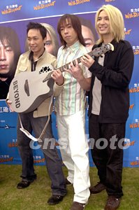 Beyond樂隊(duì)三子黃家強(qiáng)、黃貫中、葉世榮(左起)4月4日在香港出席“Beyond超越Beyond Live 03”演唱會(huì)記者會(huì),演唱會(huì)贊助商于會(huì)上向Beyond三子送上“結(jié)他”,祝賀Beyond成立二十周年,及希望演唱會(huì)成功演出。作者:鄧慶樂