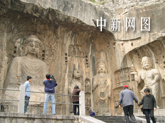 圖:網(wǎng)絡(luò)媒體記者參觀河南洛陽龍門石窟