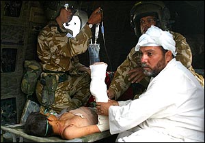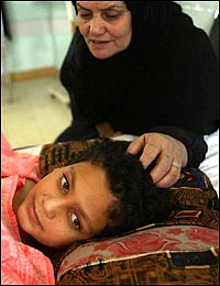 三天前,阿里對泰晤士報記者說,他最喜歡的學科是地理,因為他想旅行。昨天他忍著巨大的疼痛轉頭向他叔叔問:“我是不是很快就能旅行了?”他叔叔說他不但很快就能旅行,而且還能去捕魚。阿里家住巴格達東南部,在一次轟炸中他的床單著火,他自己火燒傷。在這次事故中,他的父母也雙雙死于這次襲擊,當時他母親已經(jīng)懷孕5個月。另外,他的兄弟和幾個姐妹也遇難。