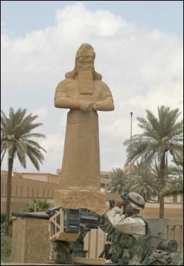 美英聯(lián)軍攻入伊拉克首都巴格達(dá)后,陷入嚴(yán)重混亂之中。伊拉克國(guó)家博物館遭到大肆洗劫,大量幾千年前的珍貴文物遭到破壞和掠奪。圖為美國(guó)海軍陸戰(zhàn)隊(duì)士兵在伊拉克國(guó)家博特館守衛(wèi)。