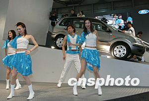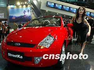 美國(guó)福特汽車(chē)公司新型跑車(chē)在美女的陪伴下十九日亮相即將開(kāi)幕的第十屆上海國(guó)際汽車(chē)展覽會(huì)。作者:趙振清