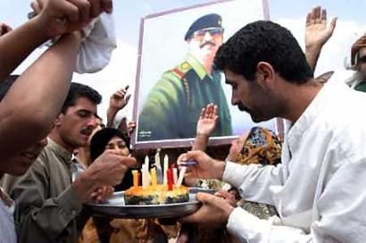 28日當(dāng)天,提克里克出現(xiàn)了數(shù)十名“不持槍”的薩達(dá)姆死黨,只見他們圍著一個自制的生日蛋糕和薩達(dá)姆畫像,在住家附近街頭又唱又跳,充分展示其對這位前總統(tǒng)的支持。不少年輕的女孩子也舉著薩達(dá)姆畫像出現(xiàn)在街頭并高喊,“我們愿意為他犧牲一切”。不過,發(fā)覺風(fēng)聲的美軍很快開著步兵戰(zhàn)車出現(xiàn)在街頭,并在其他巡邏人員配合下,強(qiáng)行結(jié)束了這個自發(fā)舉行的“生日晚會”。為此,許多當(dāng)?shù)厝吮硎,“我們想用和平方式來為薩達(dá)姆祝壽,美國鼓吹的言論自由哪里去了”?