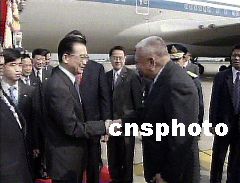 中國總理溫家寶二十九日上午飛抵泰國首都曼谷,準(zhǔn)備出席關(guān)于非典型肺炎問題的中國——東盟領(lǐng)導(dǎo)人特別會議。圖為香港特首董建華在機(jī)場迎接溫家寶總理。中新社圖