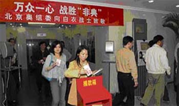 北京奧運(yùn)會(huì)的申辦和籌辦工作,一直得到全國(guó)人民的大力支持。此時(shí)此刻,向戰(zhàn)斗在一線(xiàn)的醫(yī)務(wù)工作者奉獻(xiàn)愛(ài)心,是我們向社會(huì)應(yīng)做的回報(bào)。我們相信,在以胡錦濤同志為總書(shū)記的黨中央堅(jiān)強(qiáng)領(lǐng)導(dǎo)下,在廣大醫(yī)務(wù)工作者的辛勤努力下,全國(guó)人民團(tuán)結(jié)一心,眾志成城,我們一定能夠依靠科學(xué)的力量和集體的智慧,打贏(yíng)非典型肺炎防治工作的攻堅(jiān)戰(zhàn),奪取最后的勝利。