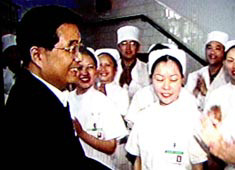 胡錦濤說,前一階段,廣大醫(yī)務(wù)工作者不辭辛勞,恪盡職守,做了大量卓有成效的工作,為防治“非典”做出了突出貢獻,黨、政府和人民感謝你們。