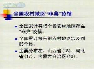 但是在這個關(guān)鍵時刻,我們絕對不能放松警惕,不能麻痹大意,我們要防治病情的反彈。特別是是我們要注意到疫情在新的情況底下蔓延,所以我要講一下第二個問題,我們要禁止疫情向農(nóng)村擴散,我們現(xiàn)在先看這個數(shù)字,現(xiàn)在全國已經(jīng)有15個省,農(nóng)村地區(qū)存在了非典疫情,已經(jīng)有85個縣分布在山西省河北省和內(nèi)蒙古自治區(qū)。這個比例比較高。另外,確診病例中,農(nóng)民占的比例雖然不高,只有6%左右,但是我們看到從5月1號開始,這個比例是持續(xù)上升的,到5月11號已經(jīng)達(dá)到了6.2%,從這個數(shù)字我們可以看到,在農(nóng)民和農(nóng)村的疫情雖然比較輕,但是有上升的趨勢,我們一定要密切注意這個疫情向農(nóng)村蔓延的趨勢。