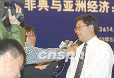 博鰲亞洲論壇《SARS與亞洲經(jīng)濟(jì)的影響評(píng)估與政策建議研討會(huì)》五月十三日開始在北京舉行,圖為出席會(huì)議的亞洲開發(fā)銀行北京辦事處首席經(jīng)濟(jì)學(xué)家湯敏接受記者訪問。