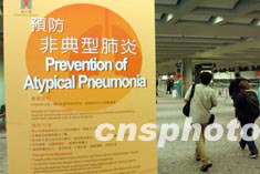近日,香港“非典”疫情逐漸趨于穩(wěn)定,香港機場管理局仍嚴格執(zhí)行各項預(yù)防“非典”措施,圖為機場隨處可見醒目的預(yù)防“非典”標語。中新社傳真 錢興強 攝