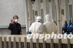 “非典”感染者、中國(guó)著名導(dǎo)演謝飛在接受二十四天的治療后痊愈,五月十六日在地壇醫(yī)出院前和醫(yī)生揮手告別。中新社記者:盛佳鵬