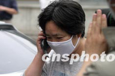 “非典”感染者、中國(guó)著名導(dǎo)演謝飛經(jīng)過二十四天的治療五月十六日治愈出院,謝飛夫人崔女士在地壇醫(yī)院外等候時(shí)打電話問候即將出院的謝飛。中新社記者:盛佳鵬