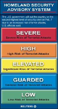 中新網(wǎng)5月21日電 美國國土安全部20日宣布,將全國安全警戒級別從五級彩色預(yù)警系統(tǒng)中的中間級別黃色提高到次高級別橙色。