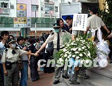為救治非典型肺炎病人而殉職的香港女醫(yī)生謝婉雯5月22日舉殯,特首董建華在醫(yī)院管理局主席梁智鴻陪同下到場(chǎng)悼念。洪少葵 攝