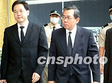 公務(wù)員事務(wù)局局長(zhǎng)王永平及政制事務(wù)局局長(zhǎng)林瑞麟,5月22日到香港殯儀館悼念為救治非典型肺炎而殉職的屯門醫(yī)院女醫(yī)生謝婉雯。洪少葵 攝