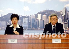 香港衛(wèi)生署長陳馮富珍及醫(yī)院管理局行政經(jīng)理劉少懷,5月22日在記者會公布新增3宗SARS個案,當中沒有醫(yī)護人員,再有3名女病人死亡。另外有10名康復(fù)者出院,香港至今已連續(xù)7天錄得少于5個SARS感染病例。洪少葵 攝