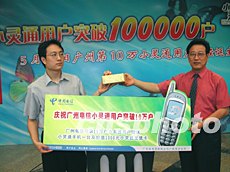 短短二十五天的時間里,廣州電信小靈通用戶突破十萬戶。廣州電信公司為二十三日產(chǎn)生的第十萬個小靈通用戶贈送紀(jì)念品。作者:鄧卓明