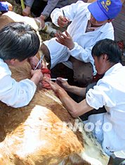 工作人員緊急搶救產(chǎn)下克隆牛的母牛。作者:龍新勇