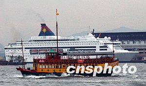 世界衛(wèi)生組織5月23日起解除對香港和廣東省維持個多月的旅游警告,稱兩地已有效控制SARS疫情。消息無疑是香港重振經(jīng)濟的強心針。圖為穿梭在維多利亞港灣的海上郵輪和仿古游船將迎接游客重臨香江。洪少葵 攝