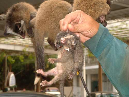 據(jù)介紹,兩單位與深圳動(dòng)物防疫監(jiān)督站、深圳野生動(dòng)植物保護(hù)站組成聯(lián)合攻關(guān)小組,追溯可能受SARS感染的動(dòng)物,普查多種動(dòng)物群體,主要集中鎖定哺乳動(dòng)物,包括果子貍、豬獾、黃鯨、鼠獾、貉、海貍鼠、貓、兔等。