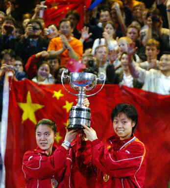 中新網(wǎng)5月25日電 象征世界女子乒壇雙打最高榮譽(yù)的波普杯,今天再一次刻上了中國人的名字。在第47屆使乒賽女雙決賽中,王楠/張怡寧技高一籌,4:1戰(zhàn)勝郭躍/牛劍峰,首次共同登頂世界最高領(lǐng)獎(jiǎng)臺(tái)。