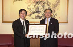 日本中華總商會28日捐資六百五十萬日元,支持中國抗擊非典型肺炎。圖為在捐款儀式上,中國駐日使館總領事張立國向總商會會長顏安(左)頒發(fā)感謝狀。中新社記者:陶光雄