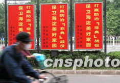 進(jìn)入五月下旬以來,北京“非典”疫情逐步下降,在北京疫情較重的海淀區(qū),醒目的街頭公益廣告提醒人們防“非典”不松懈。中新社記者:張勤