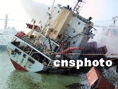 據(jù)悉,該船是混裝船,其中裝有化學品甲苯本烯酸20噸,過硫酸納20.16噸和過氧化氫16噸。共總有100多集裝箱。據(jù)相關人員介紹,此次救助活動中,沒有造成水域和空氣的污染。劉賢靈 攝