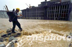 三峽水庫壩前水位六月三日十二時(shí)許升至一百一十三米高程。位于三峽壩區(qū)右岸地下電站機(jī)組進(jìn)水口開始進(jìn)水。圖為三斗坪中堡村移民莊德新正走過機(jī)組進(jìn)水口施工現(xiàn)場。作者:孫榮剛