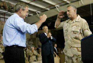 布什對(duì)2000名歡呼的美國空軍、海軍和陸軍軍人說:“這個(gè)人(薩達(dá)姆)花了數(shù)十年來隱藏他的大規(guī)模謀殺工具,他用來隱藏這些武器的地方很多,我們將尋找,我們將揭示事實(shí)。任何一個(gè)恐怖組織都將不能夠從伊拉克獲得大規(guī)模殺傷性武器,因?yàn)檫@一政權(quán)已經(jīng)崩潰。我們確保了伊拉克不會(huì)成為恐怖組織的武器庫。在伊拉克仍存在著零星的犯罪現(xiàn)象,聯(lián)軍正在伊拉克各地采取強(qiáng)有力的措施來使秩序恢復(fù)正常。美國和我們的盟國在使伊拉克的大街變得越來越安全!