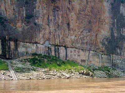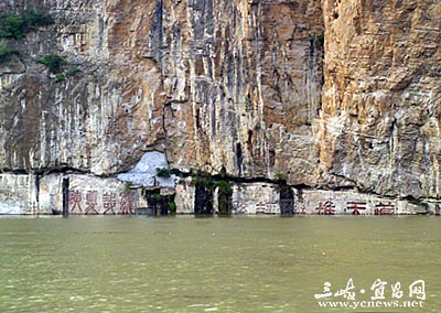 “夔門自古天下雄”。作為三峽門戶的夔門,長江在這里驟然變窄,巍峨高聳的赤甲山,絕壁千仞的白鹽山,共同夾出了以雄著稱的夔門,峽口處江面寬不到百米,最窄處僅50米。在白鹽山千仞絕壁上,從宋代至民國初年歷代詩仙詞圣留下了十余幅石壁題刻,總面積為500余平方米,大體在海拔115至119米之間。三峽蓄水后,摩崖石刻也就永遠的消逝了。跑了一輩子川江的老船長羅獻銀老人就住在這里。