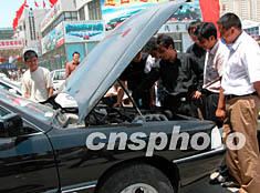 六月,北京“非典”疫情逐步得到控制,北方汽車(chē)交易市場(chǎng)客流量回升,十萬(wàn)元左右的轎車(chē)銷(xiāo)路看好。圖為汽車(chē)銷(xiāo)售人員正在為用戶(hù)介紹國(guó)產(chǎn)轎車(chē)的性能。中新社記者 張勤 攝