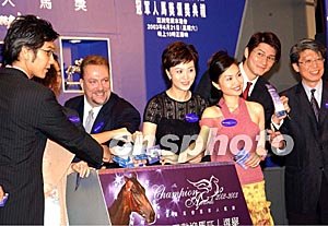 2002/2003年度香港賽馬會冠軍人馬獎頒獎典禮”記者會六月十日在香港舉行, 香港賽馬會高層人士、嘉賓以及眾多香港藝員在會上揭曉各個馬匹獎項的候選名單,并公布有關(guān)“最受公眾歡迎馬匹”。 錢興強(qiáng) 攝