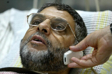6月10日,被以色列武裝直升機(jī)炸傷的巴勒斯坦伊斯蘭抵抗運(yùn)動(dòng)(哈馬斯)發(fā)言人蘭提斯在加沙城一所醫(yī)院里通過電話與外界聯(lián)系。
