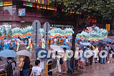 六月十五日在香港舉行的千人舞龍舞獅大巡游中,一條二百五十尺長龍穿街走巷,成為活動中一道亮麗風景。潘索菲 攝