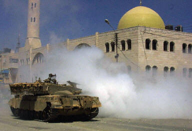 6月17日,在約旦河西岸納布盧斯附近的阿斯卡爾難民營(yíng)里,一輛以色列坦克在一座清真寺前駛過(guò)。在當(dāng)天這一地區(qū)發(fā)生的巴以沖突中,以色列軍隊(duì)開(kāi)槍打傷兩名巴勒斯坦人。