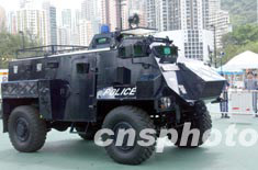 香港警務(wù)處2003年6月22日在香港維多利亞公園舉行的“同心攜手畫出彩虹”嘉年華活動上,展示警用“Saxon撒臣裝匣運兵車”。 中新社記者 錢興強