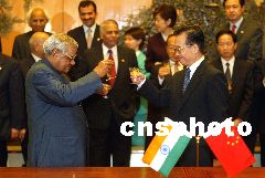 中國總理溫家寶與印度總理瓦杰帕伊二十三日上午在北京人民大會堂舉行會談,并出席中印關于簡化簽證手續(xù)的諒解備忘錄等九個文件的簽字儀式。圖為溫家寶與瓦杰帕伊舉杯共賀。中新社記者 毛建軍 攝