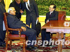 中新社北京六月二十三日電 中國國務(wù)院總理溫家寶與印度總理瓦杰帕伊二十三日晚在北京人民大會堂共同簽署了《中華人民共和國和印度共和國關(guān)系原則和全面合作的宣言》。
