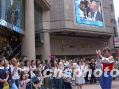 香港時(shí)代廣場(chǎng)大屏幕播放新聞后,市民歡欣鼓舞。