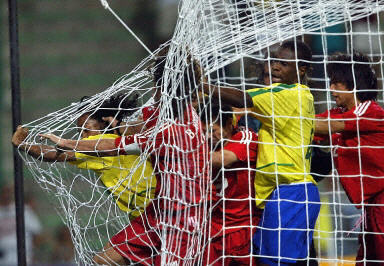 巴西隊(duì)開場(chǎng)后占據(jù)優(yōu)勢(shì)。第23分鐘,盧西奧長(zhǎng)傳,阿德里亞諾突入禁區(qū),將球挑過魯斯圖的頭頂,巴西隊(duì)1比0領(lǐng)先。