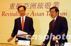 博鰲亞洲論壇秘書(shū)長(zhǎng)龍永圖(右)、香港財(cái)政司司長(zhǎng)梁錦松,六月二十六日在香港舉行記者會(huì),公布“新形勢(shì)下的國(guó)際旅游合作大會(huì)──重振亞洲旅游業(yè)”的詳情。該會(huì)議將于七月十四日至十五日在香港舉行。中新社記者 潘索菲