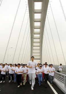 中新網(wǎng)6月28日電 世界上跨度最大的鋼拱橋——上海盧浦大橋,二十八日上午正式建成通車,小巨人姚明帶領(lǐng)千名中外長跑愛好者參加了主題為“活力上海,奔向未來”跨橋長跑活動(dòng)。