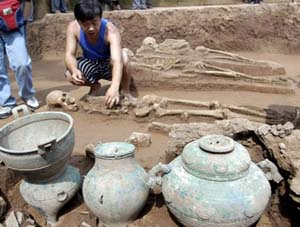 在發(fā)掘現(xiàn)場可以看到,遺址東南部寬7.3米、長9米以上的墓坑內(nèi),3具長1.6米左右的尸骨頭朝南方,整齊地擺放在墓坑中央,臉部全部向東。陳祖軍告訴記者:“這些尸體的左臂卷曲在胸前,右手都是處于非正常狀態(tài),有的是小臂和大臂緊緊地貼在一起,有的肘關節(jié)已經(jīng)錯位,所以這3具尸骨很可能是殉葬或者祭祀的犧牲品。在祭祀品下面可以隱約看見板狀的東西,可能是棺材。在厚約30厘米的土層下,可能埋有墓葬的主人。從出土器物的規(guī)格和數(shù)量來看,肯定墓葬主人是巴國的一位王侯!保牐