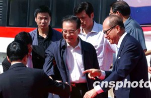 今天的葵涌碼頭一如往常一樣繁忙,人們?yōu)橛訙丶覍毜牡絹?lái),鋪上了紅地毯,擺上了鮮花,掛起了歡迎的條幅。香港長(zhǎng)實(shí)集團(tuán)主席李嘉誠(chéng)及副主席李澤鉅到碼頭迎候溫家寶一行。
