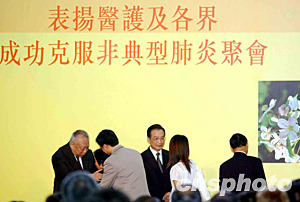 國務(wù)院總理溫家寶6月30日在香港表揚(yáng)醫(yī)護(hù)人員成功克服SARS聚會上,表彰醫(yī)護(hù)界、科研界、志愿機(jī)構(gòu)、政府部門和學(xué)校的代表,并慰問因公殉職的謝婉雯醫(yī)生、護(hù)士劉永佳等家人。洪少葵 攝