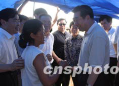 七月五日,國(guó)務(wù)院副總理回良玉來(lái)到安徽阜陽(yáng)王家壩,看望安全轉(zhuǎn)移到大堤上的受災(zāi)群眾.中新社記者:盛佳鵬