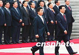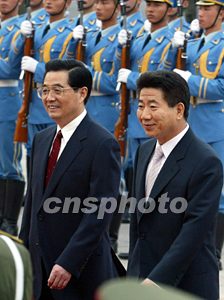 中國(guó)國(guó)家主席胡錦濤七日在北京舉行歡迎儀式,歡迎到訪的韓國(guó)總統(tǒng)盧武鉉一行。中新社記者:鄭萍萍