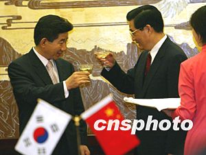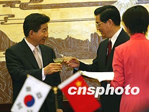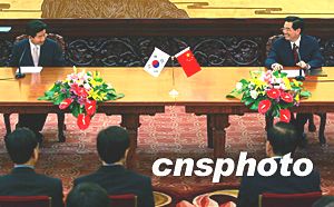 中國(guó)國(guó)家主席胡錦濤與韓國(guó)總統(tǒng)盧武鉉七日在北京共同出席雙方多個(gè)合作協(xié)議的簽字儀式。中新社記者:滿會(huì)喬
