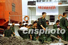 武警戰(zhàn)士八日在上海軌道四號線搶險現(xiàn)場加固臨時防護(hù)圍堰。上海昨日又降大雨,給沙堤內(nèi)側(cè)安置大型鋼制樁的施工還在緊張進(jìn)行中,預(yù)計完成臨時防汛墻沿線約三百根鋼制樁的全部安置工作,還將持續(xù)一段時間。作者:劉殊瑾