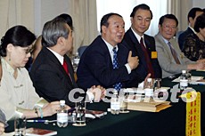 2008年北京奧運(yùn)會組委會副主席蔣效愚7月8日在北京會見以馮滬祥(右一)為團(tuán)長、郭俊次(右三)為名譽(yù)團(tuán)長的臺灣中華教授協(xié)會大陸參訪團(tuán)成員,并向他們介紹申奧過程和二零零八年北京奧運(yùn)會的準(zhǔn)備情況。中新社記者:毛建軍
